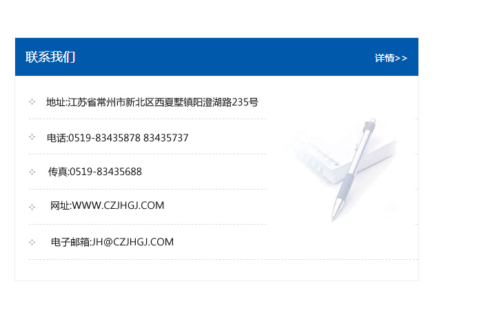地址:常州市新北區友邦商務大廈1幢16、17層  電話:0519-85101652  傳真:0519-85112595  郵編:213022  網址:www_cz-jiayue_cn.hanangwj.com  郵箱:xiajifengaa@163.com